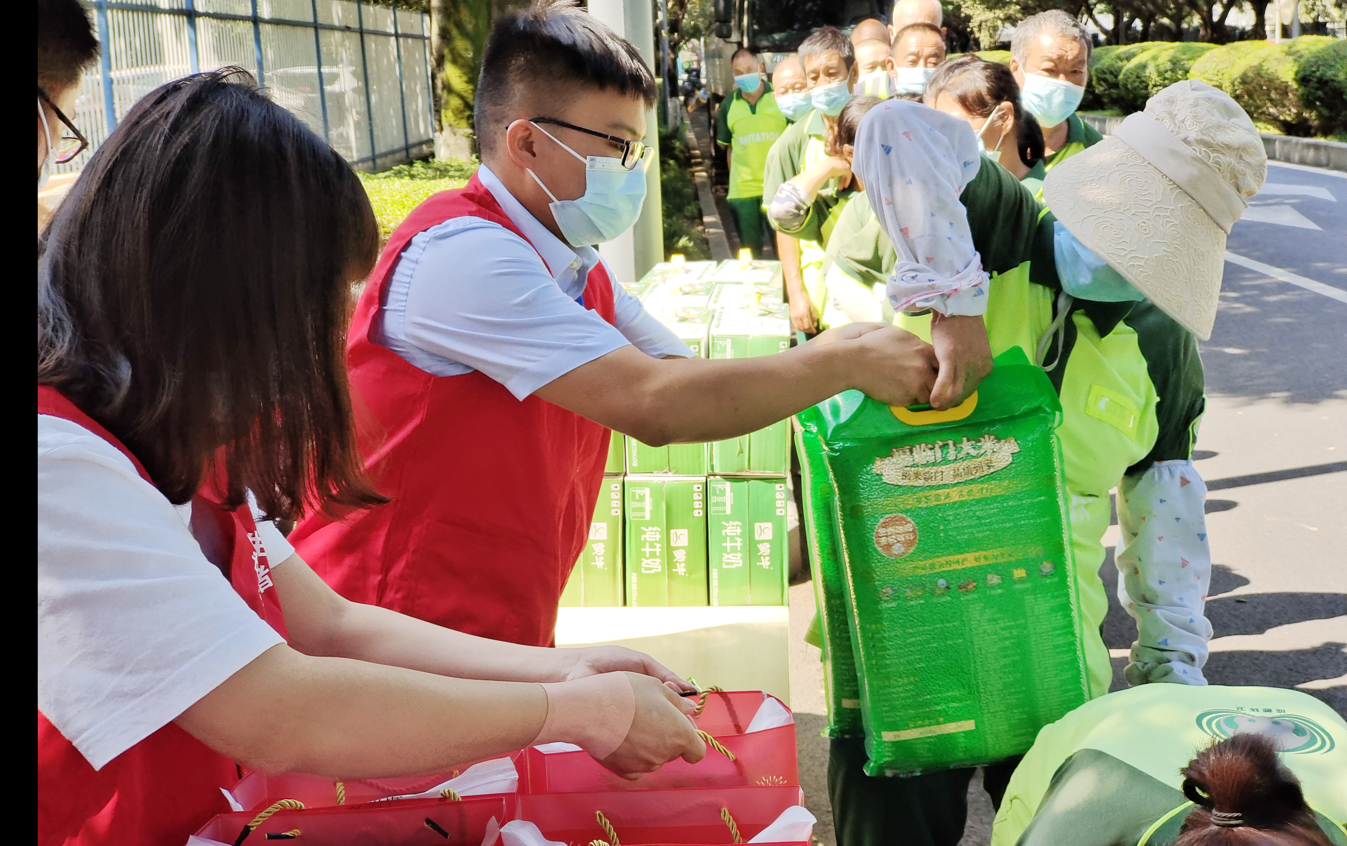 成都蓉生團(tuán)員志愿者代表向園區(qū)環(huán)衛(wèi)工人們轉(zhuǎn)達(dá)了公司對(duì)他們的謝意,感謝他們對(duì)園區(qū)環(huán)境做出的貢獻(xiàn),就公司設(shè)立“愛(ài)心小屋”情況溝通交流,并為環(huán)衛(wèi)工人們送上了牛奶、米、日化用品等慰問(wèn)品。為保障環(huán)衛(wèi)工人在路面清潔時(shí)順利作業(yè),團(tuán)員志愿者們還整理了公司周?chē)值劳7诺墓蚕韱诬?chē),以實(shí)際行動(dòng)表達(dá)對(duì)辛勤勞動(dòng)者的支持與關(guān)懷。